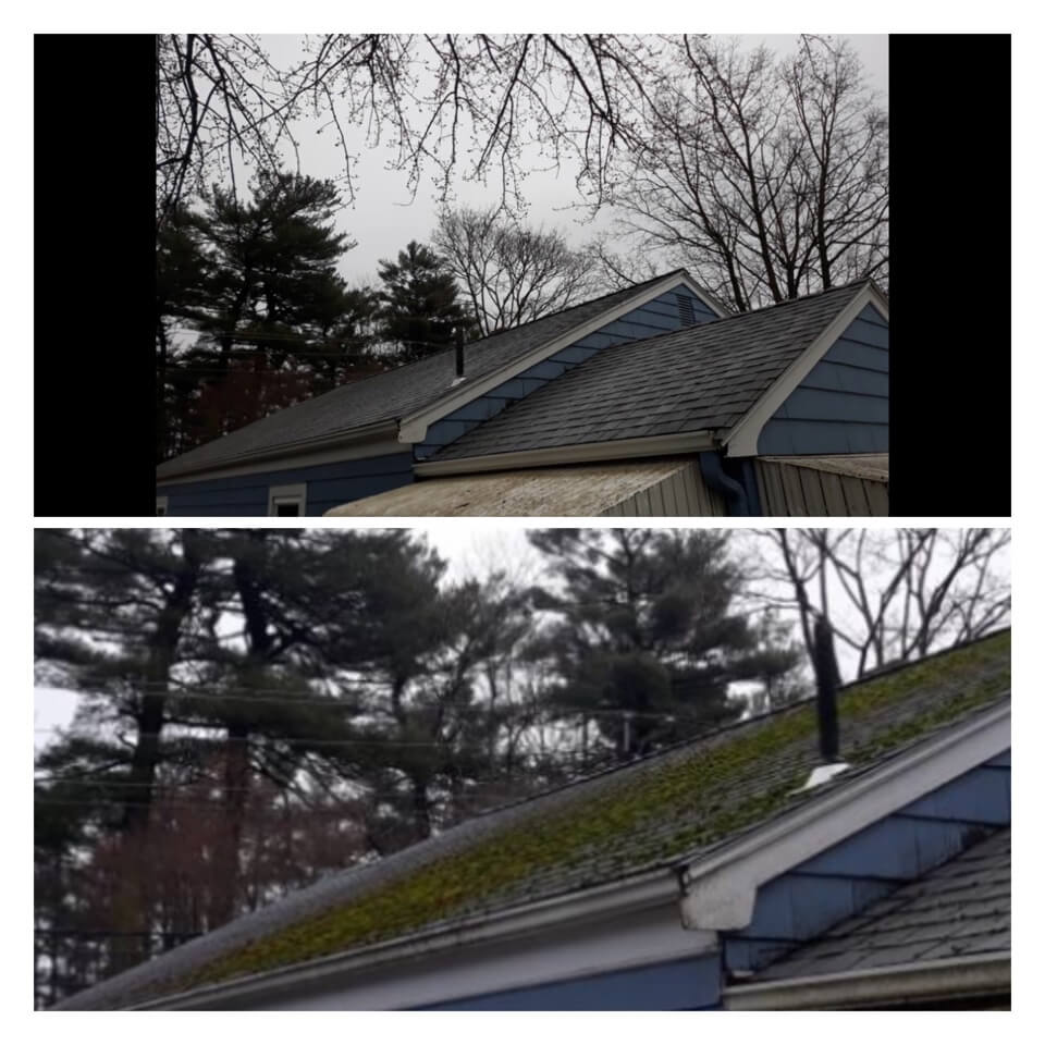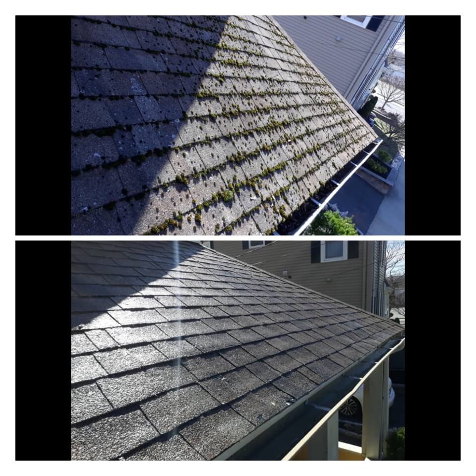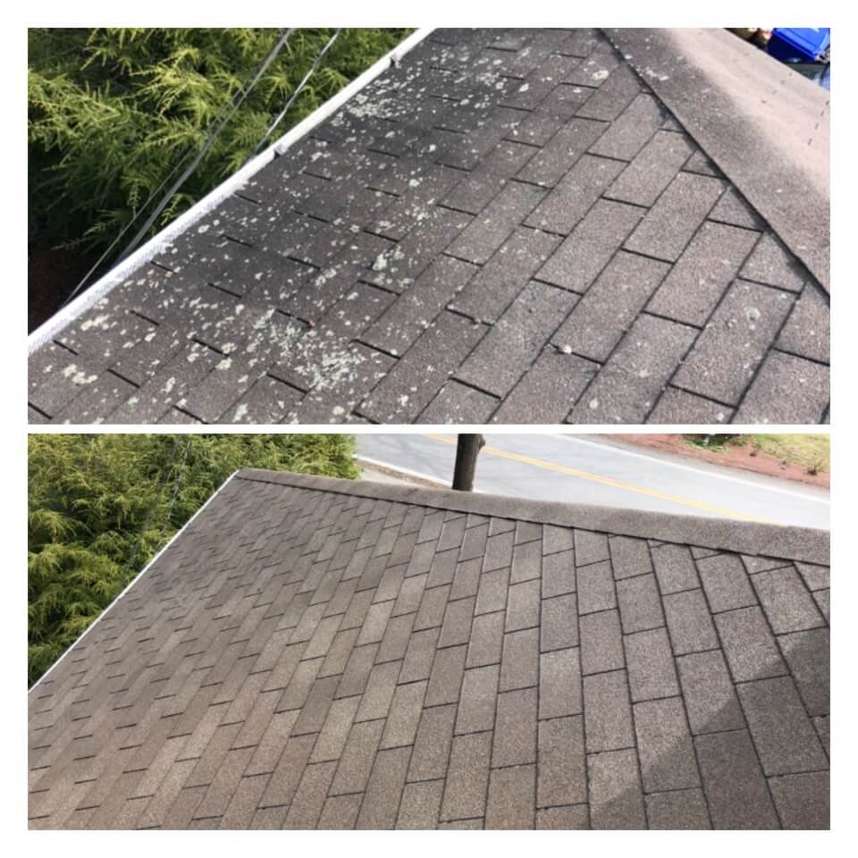 HiCleaners is the most experienced company in Mason, NH that deals with roof washing and roof soft washing. All of our employees are trained to recognize precise solution mixing ratios to provide you with the safest and most effective soft washing service. Roofs are a commonly neglected part of a house due to the fact that most people don’t have ladders to access it, so it is very easy to just leave it alone and forget about problems that may start to arise. Just like many home owners, discoloration and small bits of moss on a roof can be overlooked because of the misconception that it is just aesthetic. However, it isn’t just aesthetic, the moss slowly lifts the granules off the shingles which in turn shorten the life of the shingle. The moss also spreads, just like any bacteria if it is left alone for too long, it can quickly become a problem that spirals out of control. Call HiCleaners for a free quote, we only use the most advanced eco-friendly solutions and equipment to make sure the job is done right, for the safety of the employees, your plants, grass, pets, and children.